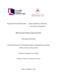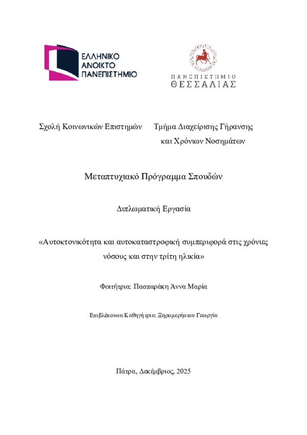 Περίληψη (Abstract): Η παρούσα εργασία εξετάζει την αυτοκτονικότητα και την αυτοκαταστροφική συμπεριφορά σε δύο ιδιαίτερα ευάλωτες ομάδες: τα άτομα με χρόνιες παθήσεις και τους ηλικιωμένους. Το ενδιαφέρον για το θέμα προκύπτει από την αυξημένη συχνότητα αυτοκτονικού ιδεασμού σε άτομα που ζουν με μακροχρόνιες σωματικές δυσκολίες, αλλά και από τις σημαντικές ψυχολογικές και κοινωνικές προκλήσεις που συνοδεύουν τη γήρανσ...