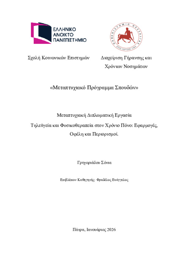 Περίληψη (Abstract): Ο χρόνιος πόνος αποτελεί ένα σύνθετο και πολυπαραγοντικό πρόβλημα δημόσιας υγείας, με σημαντικές επιπτώσεις στη λειτουργικότητα, την ποιότητα ζωής και τη συμμετοχή των ατόμων στην καθημερινή ζωή. Η σύγχρονη κατανόησή του υπερβαίνει τα στενά βιοϊατρικά μοντέλα και ενσωματώνει βιολογικές, ψυχολογικές και κοινωνικές διαστάσεις, καθιστώντας αναγκαία την υιοθέτηση ολιστικών και ανθρωποκεντρικών προσεγγ...