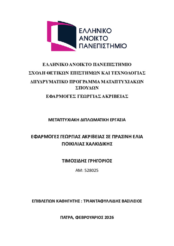 Περίληψη (Abstract): Στην παρούσα μεταπτυχιακή διπλωματική εργασία εξετάζεται η εφαρμογή Γεωργίας Ακριβείας στην καλλιέργεια της πράσινης επιτραπέζιας ελιάς ποικιλίας Χαλκιδικής έχοντας ως στόχο τη βελτιστοποίηση της διαχείρισης των καλλιεργητικών εισροών, τη μείωση του κόστους παραγωγής και των περιβαλλοντικών επιπτώσεων, διατηρώντας παράλληλα υψηλά επίπεδα παραγωγής και ποιοτικά χαρακτηριστικά.Η πράσινη ελιά Χαλκιδι...