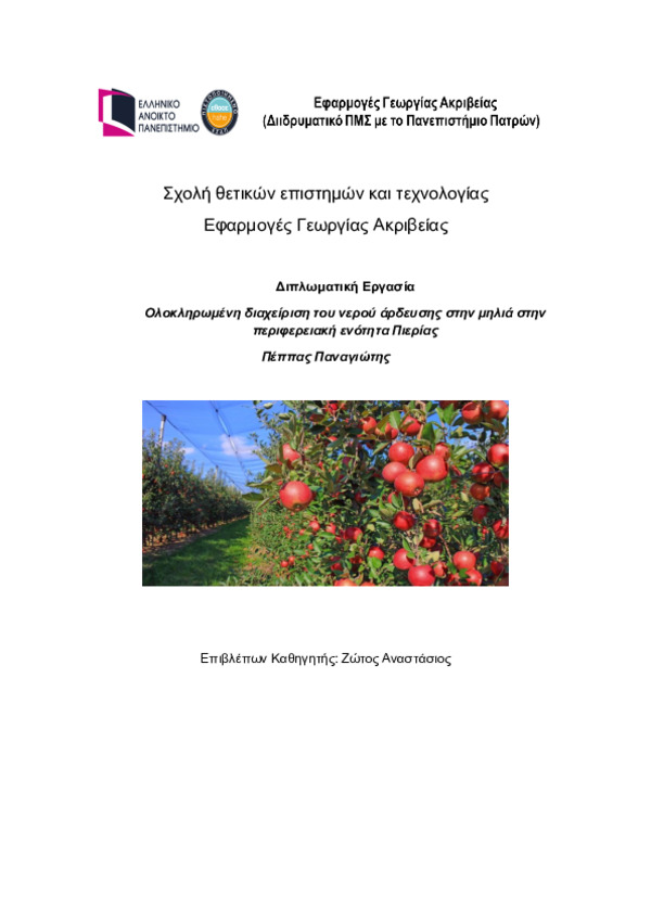 Περίληψη (Abstract): Η παρούσα μελέτη αφορά την εφαρμογή σύγχρονων μεθόδων άρδευσης στην καλλιέργεια της μηλιάς. Σε μια εποχή που η διαθεσιμότητα του νερού, λόγω της κλιματικής αλλαγής, σε πολλές περιοχές του κόσμου είναι συνεχώς μειούμενη και προορίζεται κυρίως προς τις αστικές περιοχές, είναι ζωτικής σημασίας η σωστή διαχείριση και εξοικονόμηση του αρδευτικ...