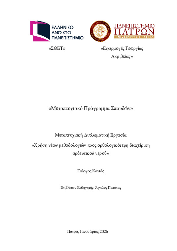 Περίληψη (Abstract): Η ορθολογική διαχείριση του αρδευτικού νερού αποτελεί κρίσιμο παράγοντα για την αντιμετώπιση των προκλήσεων της κλιματικής αλλαγής, της λειψυδρίας και την εξασφάλιση της επισιτιστικής ασφάλειας για τον αυξανόμενο παγκόσμιο πληθυσμό, ιδίως σε άνυδρες περιοχές όπως της ευρύτερης λεκάνης της Μεσογείου. Η παρούσα μεταπτυχιακή εργασία στοχεύει στην ανάδειξη των πλεονεκτημάτων της χρήσης νέων μεθοδολογι...