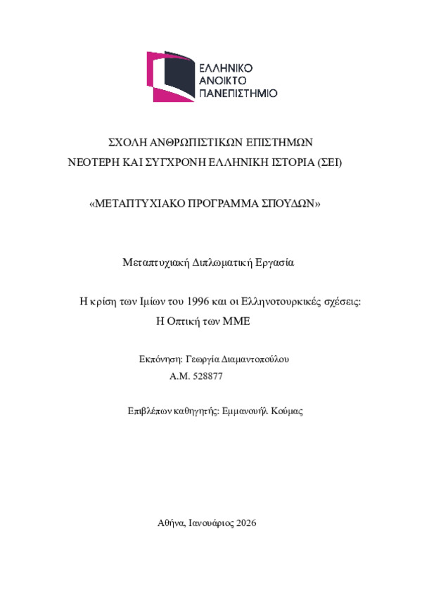 The Imia crisis of 1996 and Greek-Turkish relations: The Media Perspective [Αγγλική]