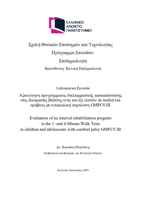 Περίληψη (Abstract): ΕισαγωγήΗ ικανότητα βάδισης αποτελεί βασικό παράγοντα λειτουργικής κινητικότητας, συμμετοχής και ποιότητας ζωής στα παιδιά και τους εφήβους με εγκεφαλική παράλυση (ΕΠ). Τα άτομα που κατατάσσονται στο επίπεδο III του Συστήματος Ταξινόμησης Αδρής Κινητικής Λειτουργίας (GMFCS) συνήθως περπατούν με εξωτερική υποστήριξη και παρουσιάζουν σημαντικούς περιορισμούς στην αντοχη...