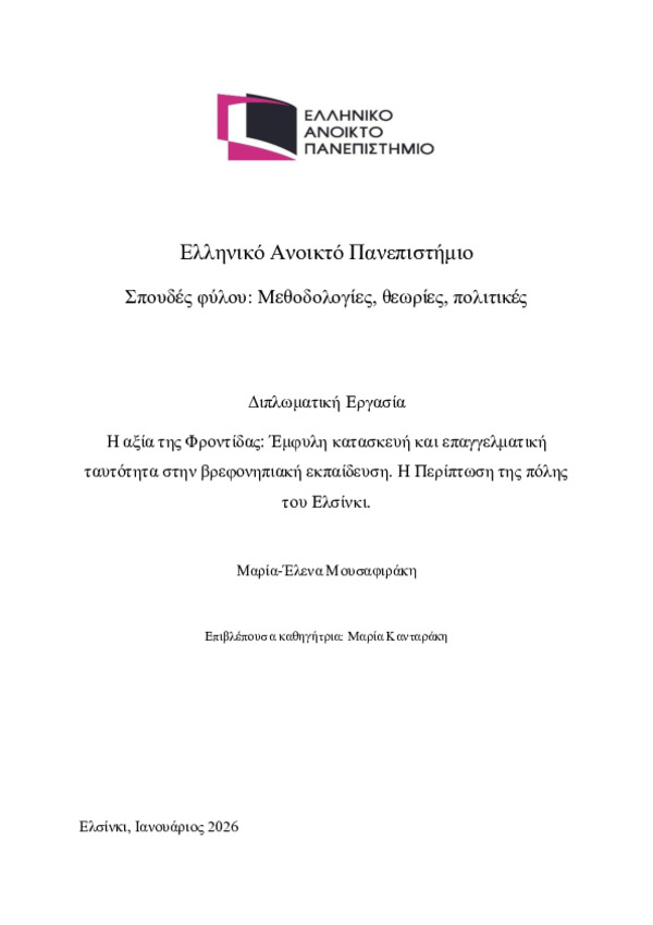 Περίληψη (Abstract): Η παρούσα μεταπτυχιακή εργασία διερευνά την εργασία φροντίδας στην προσχολικήεκπαίδευση στη Φινλανδία, εστιάζοντας στον τρόπο με τον οποίο οι εργαζόμενοι και οιεργαζόμενες νοηματοδοτούν τη φροντίδα και συγκροτούν την επαγγελματική τουςταυτότητα στο πλαίσιο ενός θεσμικά «πρότυπου» κράτους πρόνοιας. Αντλώντας από τηφεμινιστική ηθική της φροντίδας, τη θεωρία της συναισθηματικής εργασίας και τηδιαθεμα...