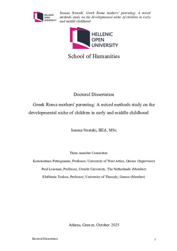 Τίτλος σε άλλη γλώσσα: Γονικότητα ελληνίδων Ρομά μητέρων: Μία μελέτη μικτών μεθόδων του αναπτυξιακού θύλακα των παιδιών στην πρώιμη και μέση παιδική ηλικία [Ελληνική] Ημερομηνία: 21-10-2025 Συγγραφέας: ΙΩΑΝΝΑ ΣΤΡΑΤΑΚΗ Σχολή: Σχολή Ανθρωπιστικών Επιστημών Περίληψη (Abstract): This thesis dealed with the exploration of parenting of the Greek Roma mothers in early and middle childhood through the lens of Developmental Niche (DN). The Greek Roma population is considered as a vulnerable social group, experiencing significant material deprivation, high unemployment, inadequate education, and marginalisation due to racism and discrimination. The study explored the physical a...