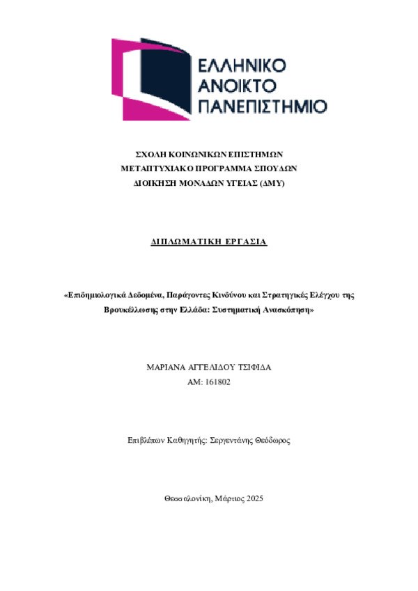 Περίληψη (Abstract): Η βρουκέλλωση εξακολουθεί να αποτελεί μία από τις σημαντικότερες ζωοανθρωπονόσους παγκοσμίως, επηρεάζοντας τόσο τη δημόσια υγεία, όσο και την κτηνοτροφική παραγωγή. Παρά τις προσπάθειες ελέγχου και εκρίζωσης, η νόσος παραμένει ενδημική, με την Ελλάδα να καταγράφει τον υψηλότερο αριθμό κρουσμάτων μεταξύ των χωρών της Ευρώπης. Η παρούσα μελέτη αποσκοπεί στην καταγραφή των πρόσφατων επιδημιολογικών δ...