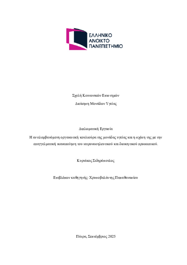 The perceived organizational culture of the health unit and its relationship with the professional satisfaction of the medical, nursing and administrative staff. [Αγγλική]