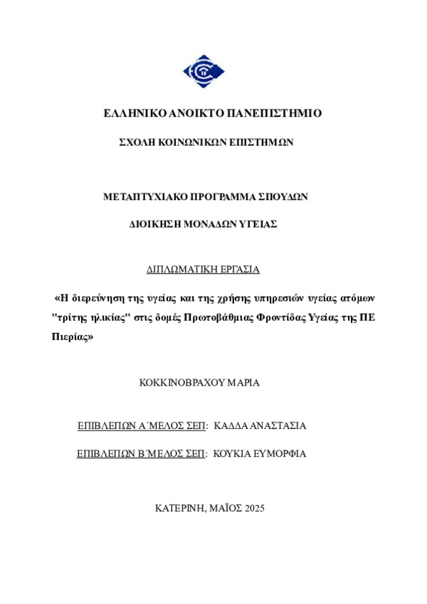 Investigation of health and health services use by the "elderly" in Primary Health Care facilities in the Regional Unit of Pieria [Αγγλική]