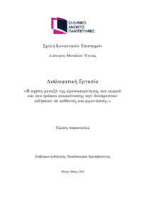 Περίληψη (Abstract): Εισαγωγή: Η παροχή ποιοτικών υπηρεσιών φροντίδας υγείας προϋποθέτει αφενός την εξασφάλιση ενός καλού επιπέδου υγείας και αφετέρου ένα ισορροπημένο εργασιακό περιβάλλον για τους νοσηλευτές, οι οποίοι αποτελούν τον πυρήνα των υγειονομικών συστημάτων. Ο όρος υγεία, παράλληλα, τείνει βάσει του ψυχοκοινωνικού μοντέλου υγείας να επεκταθεί στην ισορροπία μεταξύ της σωματικής, της ψυχικής υγείας και του ά...