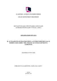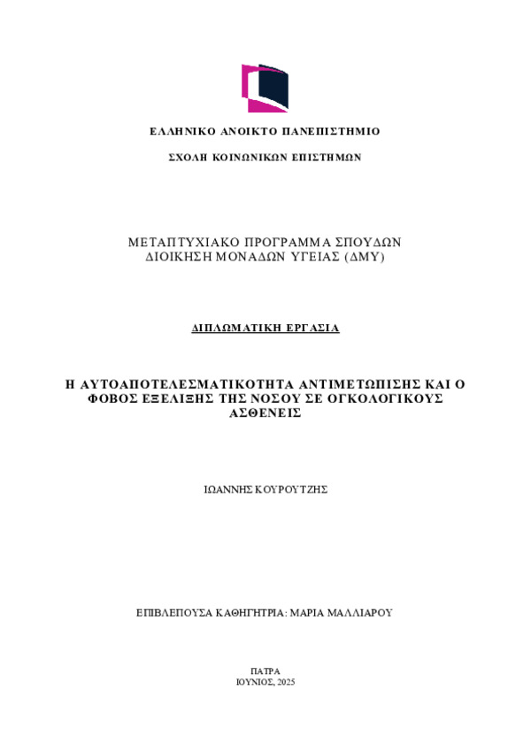 Περίληψη (Abstract): Εισαγωγή:Ο φόβος εξέλιξης της νόσου (Fear of Progression - FoP) αποτελεί μια συχνή ψυχολογική κατάσταση στους ογκολογικούς ασθενείς, επηρεάζοντας την ποιότητα ζωής και την ψυχική τους ευημερία. Η αυτο-αποτελεσματικότητα, δηλαδή η αντιλαμβανόμενη ικανότητα διαχείρισης της ασθένειας, θεωρείται πιθανός προστατευτικός παράγοντας απέναντι στον FoP.Σκοπός:Σκοπός της παρούσας μελέτης ήταν η διερεύνηση τη...