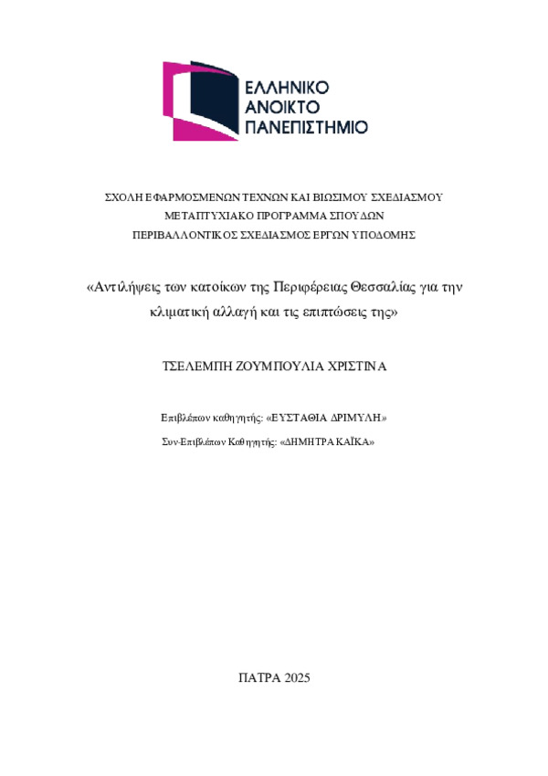 Περίληψη (Abstract): Περιβαλλοντικά ζητήματα όπως η ξαρασία και οι καύσωνες απειλούν σημαντικά το περιβάλλον και τις ανθρώπινες κοινωνίες. Η εξέταση του φαινομένου «Daniel» και οι επακόλουθες σοβαρές πλημμύρες κατέδειξαν πως η κλιματική κρίδη επηρεάζει άμεσα τις κοινωνικοοικονομικές συνθήκες στην περιοχή της Θεσσαλίας. Σκοπός της διπλωματικής εργασίας είναι να προσδιορίσει τον βαθμό στον οποίο οι κάτοικοι της Περιφέρε...