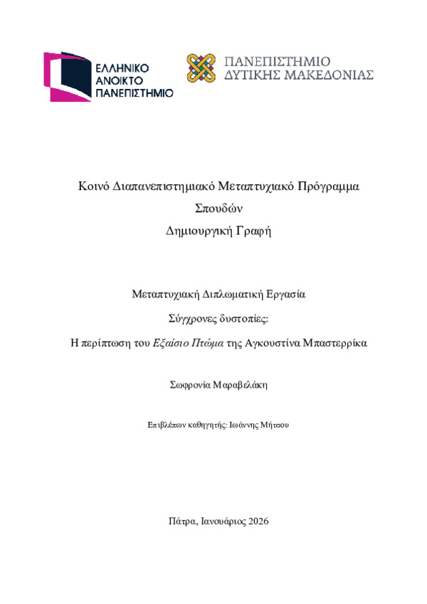 Abstract: Η παρούσα εργασία εξετάζει τη δυστοπική λογοτεχνία ως μορφή κοινωνικού, πολιτικού και ηθικού σχολιασμού, με κεντρικό άξονα το μυθιστόρημα Εξαίσιο Πτώμα της Αγκουστίνα Μπαστερρίκα. Στόχος της έρευνας είναι αφενός η θεωρητική χαρτογράφηση της δυστοπίας ως είδους και αφετέρου η εις βάθος ανάλυση του συγκεκριμένου έργου μέσα από οικοκριτική και βιοηθική οπτική, καθώς και η διερεύνηση των δυνατοτήτων δ...