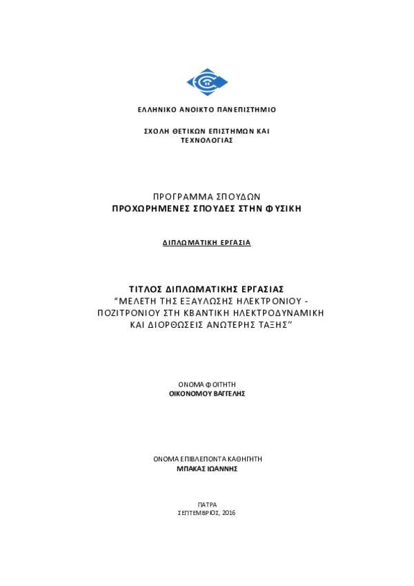Περίληψη (Abstract): Σκοπός της εργασίας είναι η εισαγωγή στη κβαντική θεωρία πεδίου και η μελέτη της εξαΰλωσης ηλεκτρονίου-ποζιτρονίου στην κβαντική ηλεκτροδυναμική.