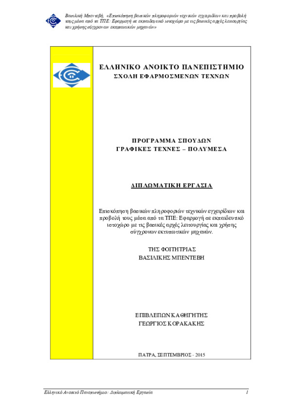 Περίληψη (Abstract): Η παρούσα διπλωματική εργασία πραγματεύεται την επισκόπηση βασικών πληροφοριών τεχνικών εγχειριδίων σύγχρονων εκτυπωτικών μηχανών και προβολή τους μέσα από τις Τεχνολογίες Πληροφορίας και Επικοινωνιών (ΤΠΕ) εστιάζοντας στην εκπαιδευτική διαδικασία. Περιλαμβάνει βιβλιογραφική επισκόπηση εκπαιδευτικών μεθόδων στην τεχνική (επαγγελματική) εκπαίδευση κάνοντας χρήση υπολογιστή. Στόχος της έρευνας είν...