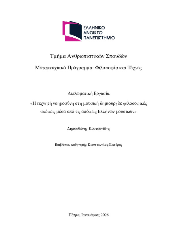 Περίληψη (Abstract): Η παρούσα εργασία εξετάζει τη σχέση μεταξύ μουσικής δημιουργίας και τεχνολογίας, μεέμφαση στη σύγχρονη χρήση της τεχνητής νοημοσύνης στη μουσική σύνθεση. Στόχος της έρευνας είναι η διερεύνηση του τρόπου με τον οποίο η τεχνητή νοημοσύνη επηρεάζει θεμελιώδεις έννοιες της μουσικής σύνθεσης, όπως η δημιουργικότητα, η ανθρώπινη πρόθεση, η αυθεντικότητα και η καλλιτεχνική αξία. Η μελέτη στηρίζεται σε έν...