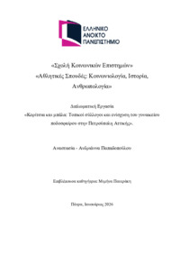 Περίληψη (Abstract): Το φύλο επηρεάζει ιστορικά την πρόσβαση στον αθλητισμό, τη διαμόρφωση ταυτοτήτων όπως επίσης και τις μεθόδους με τις οποίες η σύγχρονη κοινωνία αντιλαμβάνεται τα δυο φύλα αθλητών. Η εν λόγω εργασία μελετά τις έμφυλες διαφορές στα σπορ, τα στερεότυπα που τις ενισχύουν, τις εξελίξεις σε κοινωνικό επίπεδο με απώτερο σκοπό την προώθηση της ισότητας, καθώς και την προσβασιμότητα των γυναικών στον αθλητ...