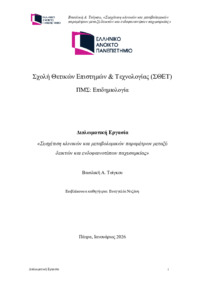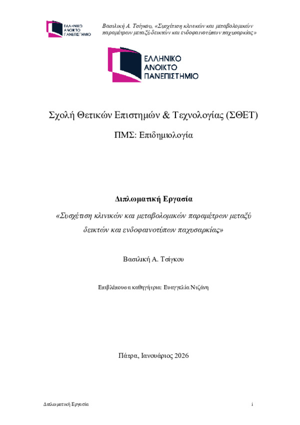 Τίτλος σε άλλη γλώσσα: Associations between clinical and metabolomic parameters among obesity indices and endophenotypes [Αγγλική] Ημερομηνία: 7-3-2026 Συγγραφέας: ΒΑΣΙΛΙΚΗ ΤΣΙΓΚΟΥ Σχολή: Σχολή Θετικών Επιστημών και Τεχνολογίας Τμήμα: Επιδημιολογία (ΕΠΙ) Περίληψη (Abstract): Η παχυσαρκία αποτελεί ένα χρόνιο νόσημα που σχετίζεται με την εμφάνιση μιας σειράς χρόνιων διαταραχών συμπεριλαμβανομένων των καρδιαγγειακών νοσημάτων και του σακχαρώδους διαβήτη. Ο συχνότερα χρησιμοποιούμενος δείκτης ανίχνευσης και ταξινόμησης της παχυσαρκίας είναι ο δείκτης μάζας σώματος που, ωστόσο, δε λαμβάνει υπόψη την κατανομή του αυξημένου σωματικού λίπους στην παχυσαρκία. Σύμφωνα με τη βιβ...