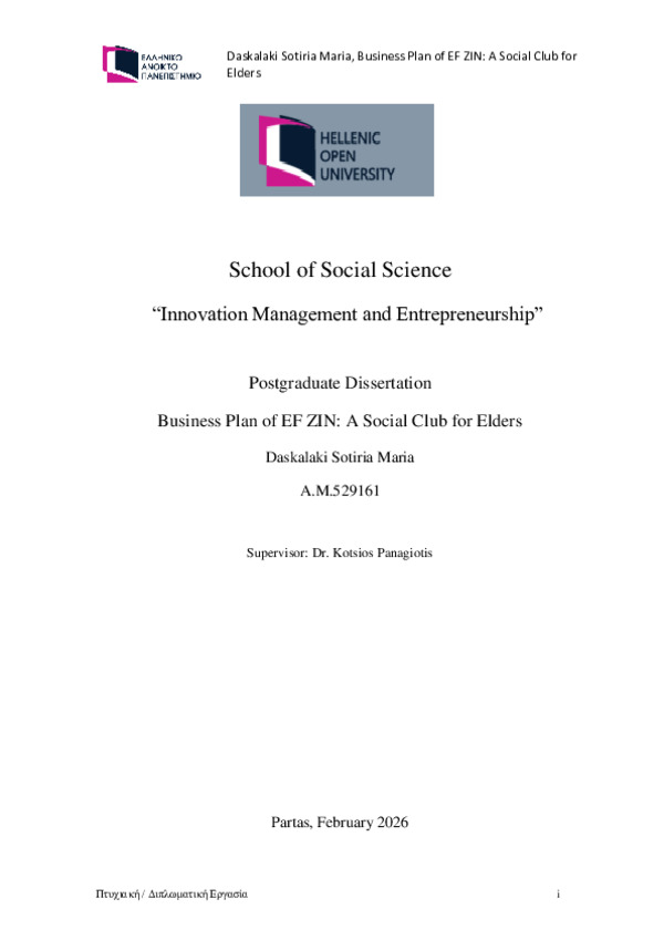 Τίτλος σε άλλη γλώσσα: Επιχειρηματικό Πλάνο Ευ Ζην: Μία Κοινωνική Λέσχη Υπηρελίκων [Ελληνική] Ημερομηνία: 7-3-2026 Συγγραφέας: ΣΩΤΗΡΙΑ-ΜΑΡΙΑ ΔΑΣΚΑΛΑΚΗ Σχολή: Σχολή Κοινωνικών Επιστημών Τμήμα: Innovation Management and Entrepreneurship (IME) Περίληψη (Abstract): The paper examines the conception, design, and implementation of a startegic business planfor a social club for retirees and elders in Rhodes island Greece. Even though the percentageof elderly people is increasing, the market and entrepreneurs tend to overlook this importantmarket segment who also wants their desires pleased and are willing to pay for it. Thebusinessmen think that elders live out...