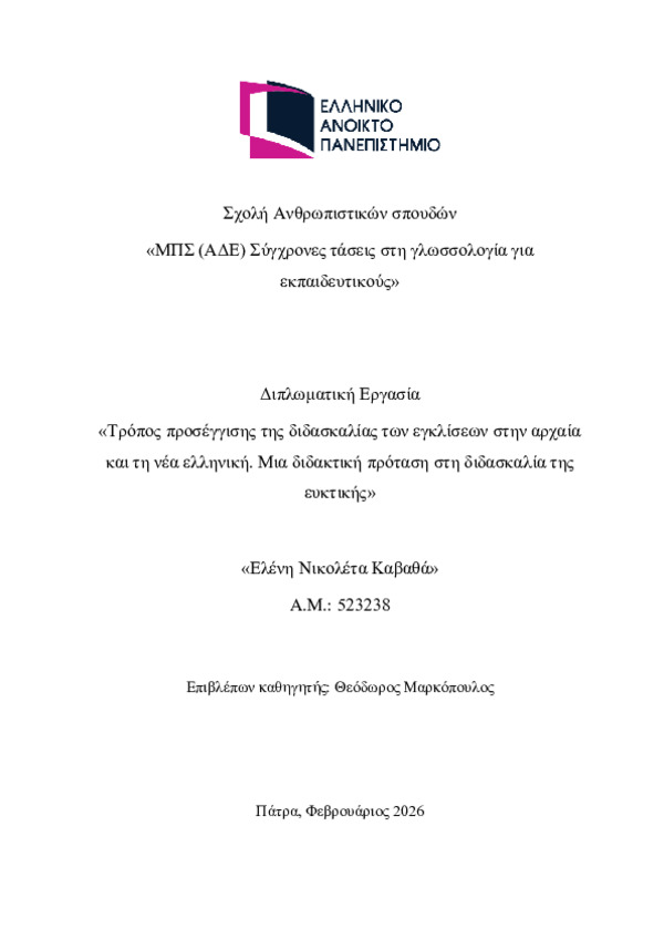 Περίληψη (Abstract): Η παρούσα εργασία επικεντρώνεται στον τρόπο προσέγγισης της διδασκαλίας των εγκλίσεων τόσο στην αρχαία όσο και στη νέα ελληνική γλώσσα. Ακολουθείται ο ίδιος τρόπος παρουσίασης των εγκλίσεων στην εργασία και στις δύο περιπτώσεις. Στην αρχή, γίνεται αναφορά στον τρόπο που περιγράφονται οι εγκλίσεις της αρχαίας και της νέας ελληνικής στα αντίστοιχα σχολικά εγχειρίδια (τις γραμματικές και το συντακτικ...