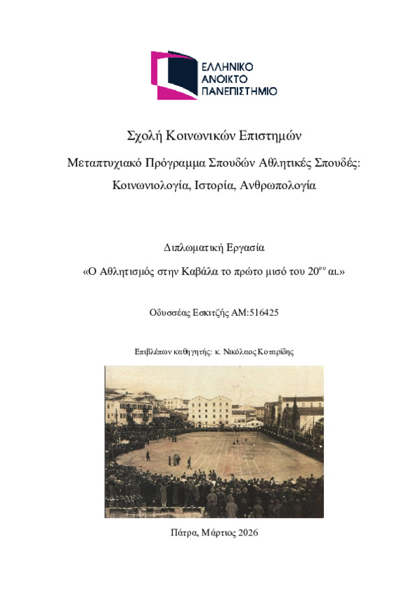 Τίτλος σε άλλη γλώσσα: Sports in Kavala during the first half of the 20th century [Αγγλική] Ημερομηνία: 7-3-2026 Συγγραφέας: ΟΔΥΣΣΕΑΣ ΕΣΚΙΤΖΗΣ Σχολή: Σχολή Κοινωνικών Επιστημών Τμήμα: Αθλητικές Σπουδές: Κοινωνιολογία, Ιστορία, Ανθρωπολογία (ΑΣΚ) Περίληψη (Abstract): Ο αθλητισμός στην Καβάλα εμφανίστηκε το 1906 στα πλαίσια του Μακεδονικού Αγώνα ενάντια στα σχέδια της Μεγάλης Βουλγαρίας που ιδρύθηκε με την Συνθήκη του Αγίου Στεφάνου (Φεβρ.1878). Το 1835 εγκαταστάθηκε προξενικό γραφείο της Ελλάδας στην Καβάλα που μέχρι το 1913 εξυπηρετούσε τα συμφέροντα του ελληνισμού. Από το 1864 η Ελληνορθόδοξη Κοινότητα λειτουργούσε με βάση τους Γενικούς Κανονισμούς του Οικου...
