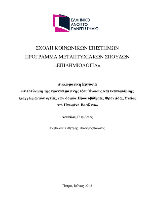 Τίτλος σε άλλη γλώσσα: Investigating burnout and job satisfaction among General Practitioners in the United Kingdom [Αγγλική] Ημερομηνία: 26-07-2025 Συγγραφέας: ΛΕΩΝΙΔΑΣ ΓΙΑΜΒΡΙΑΣ Σχολή: Σχολή Θετικών Επιστημών και Τεχνολογίας Τμήμα: Επιδημιολογία (ΕΠΙ) Περίληψη (Abstract): ΕΙΣΑΓΩΓΗ:Εν μέσω αυξανόμενης ανησυχίας για τις πραγματικές αντοχές των γενικών ιατρών, τον όγκο της γραφειοκρατίας και την επιδείνωση του ηθικού τους, η έρευνα στοχεύει στη διερεύνηση του αντίκτυπου τις επαγγελματικής τους ζωής στη σωματική, ψυχική, προσωπική ζωή και στην επαγγελματική ικανοποίηση. Παρά την ύπαρξη ποσοτικών ερευνών πάνω σε παρόμοια ζητήματα, η μελέτη υιοθετεί μία ποιοτική προσέγγι...