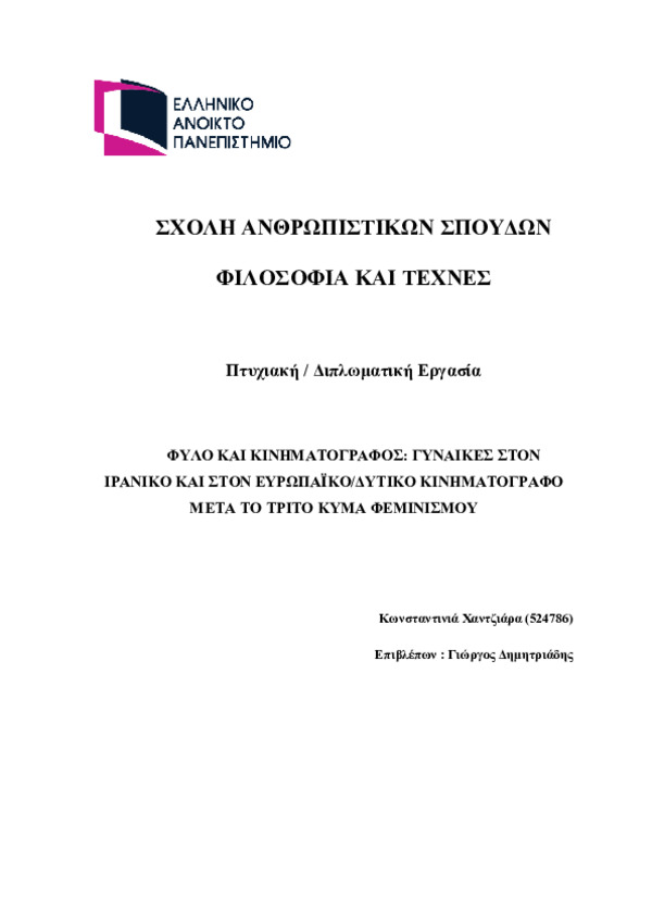 Περίληψη (Abstract): Η παρούσα διπλωματική εργασία πραγματεύεται τη σύνδεση ανάμεσα στον φεμινισμό και τον κινηματογράφο από κοινωνιολογική σκοπιά , εστιάζοντας στον τρόπο με τον οποίο ο κινηματογράφος λειτουργεί τόσο ως αντανάκλαση όσο και ως παραγωγός κοινωνικών αντιλήψεων για το φύλο. Η μελέτη διερευνά πώς η κινηματογραφική αφήγηση και οι οπτικοί κώδικες διαμορφώνουν τη συλλογική αντίληψη ("πολιτική της συλλογικότη...