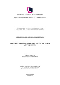 Περίληψη (Abstract): Η παρούσα διπλωματική εργασία εξετάζει τα δίκτυα Petri ως ένα εργαλείο για τον χρονικό προγραμματισμό τεχνικών και κατασκευαστικών έργων. Αναλύεται το αντικείμενο της διπλωματικής και οι στόχοι εκπόνησης της. Αρχικά, μέσα από την βιβλιογραφική ανασκόπηση, παρουσιάζεται το θεωρητικό υπόβαθρο των δικτύων Petri, οι ιδιότητες που τα διέπουν καθώς και οι κατηγορίες που έχουν αναπτυχθεί. Στην συνέχεια α...