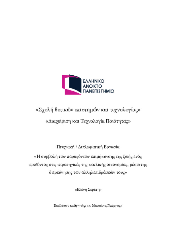 Περίληψη (Abstract): Στην παρούσα ΜΔΕ (Μεταπτυχιακή Διπλωματική Εργασία), εξετάζεται ο τρόπος με τον οποίο παράγοντες που επηρεάζουν το χρόνο ζωής ενός βιομηχανικού θερμοστάτη μπορούν να ευθυγραμμιστούν με τις αρχές της κυκλικής οικονομίας, της βιωσιμότητας και της πράσινης ανάπτυξης. Ένας σύγχρονος βιώσιμος και συχνά παρατηρημένος τρόπος για την προώθηση των αρχών της κυκλικής οικονομίας, είναι η έμφαση στη μελέτη πρ...