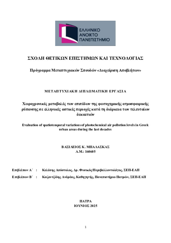 Περίληψη (Abstract): Η φωτοχημική ρύπανση αποτελεί ένα από τα μεγαλύτερα προβλήματα υποβάθμισης της ποιότητας του αέρα στο περιβάλλον αστικών περιοχών, με επιπτώσεις στη δημόσια υγεία, το κλίμα και τα οικοσυστήματα. Στην παρούσα διπλωματική εργασία εξετάζονται οι χωροχρονικές μεταβολές των σημαντικών δεικτών φωτοχημικής ρύπανσης, δηλαδή των συγκεντρώσεων των ΝΟ, ΝΟ2 και Ο3, στις ευρύτερες αστικές περιοχές της Αθήνας κ...