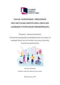 Περίληψη (Abstract): Η παρούσα εργασία πραγματεύεται τη διερεύνηση των προτύπων τουριστικής συμπεριφοράς των ΑμεΑ και των συνοδών τους και το βαθμό προσβασιμότητας στους ελληνικούς τουριστικούς προορισμούς. Ύστερα από μία θεωρητική προσέγγιση του θέματος με ανασκόπηση της υπάρχουσας επιστημονικής βιβλιογραφίας, παρατίθενται τα αποτελέσματα ποσοτικής έρευνας που διενεργήθηκε με τη χρήση ψηφιακού ερωτηματολογίου και απα...