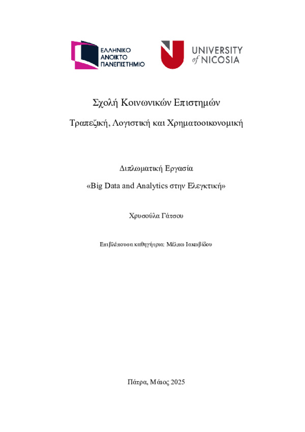 Περίληψη (Abstract): Η παρούσα διπλωματική εργασία εξετάζει τη σχέση μεταξύ των Μεγάλων Δεδομένων (Big Data) και της Ελεγκτικής, συνδυάζοντας θεωρητική επισκόπηση και εμπειρική έρευνα. Αναλύεται ο τρόπος με τον οποίο οι τεχνολογίες ανάλυσης Big Data επηρεάζουν τις ελεγκτικές διαδικασίες, τα εργαλεία και την επαγγελματική κρίση των ελεγκτών. Για τη συλλογή δεδομένων πραγματοποιήθηκε ποσοτική έρευνα με ερωτηματολόγιο σε...