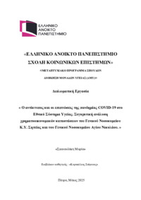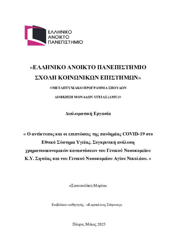 Περίληψη (Abstract): Η πανδημία COVID-19 αποτέλεσε μια άνευ προηγουμένου πρόκληση για τα παγκόσμια συστήματα υγείας, προκαλώντας σοβαρές οικονομικές και οργανωτικές πιέσεις στα δημόσια νοσοκομεία. Η παρούσα διπλωματική εργασία διερευνά τις επιπτώσεις της πανδημίας στο Εθνικό Σύστημα Υγείας (ΕΣΥ), εστιάζοντας ιδιαίτερα στις χρηματοοικονομικές συνέπειες που προέκυψαν λόγω των αυξημένων δημόσιων δαπανών για την ενίσχυση ...