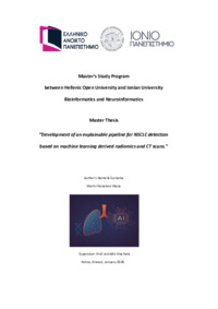 Τίτλος σε άλλη γλώσσα: Ανάπτυξη μοντέλου μηχανικής μάθησης για την ανίχνευση του μη μικροκυτταρικού καρκίνου του πνεύμονα (NSCLC) μέσω αξιοποίησης ραδιομικών χαρακτηριστικών από αξονικές τομογραφίες. [Ελληνική] Ημερομηνία: 07-03-2026 Συγγραφέας: ΠΑΡΑΣΚΕΥΗ - ΒΛΑΣΙΑ ΜΑΡΙΝΗ Σχολή: Σχολή Θετικών Επιστημών και Τεχνολογίας Τμήμα: Βιοπληροφορική και Νευροπληροφορική (ΒΝΠ) Περίληψη (Abstract): Objectives:Lung cancer remains one of the leading causes of cancer-related mortality worldwide, with non-small cell lung cancer (NSCLC) accounting for approximately 85% of cases. However, early and accurate diagnosis remains a major challenge. This study aims to develop and evaluate an explainable radiomics-based pipeline for discriminating NSCLC subtypes and differentiating NSCLC from small cell ...