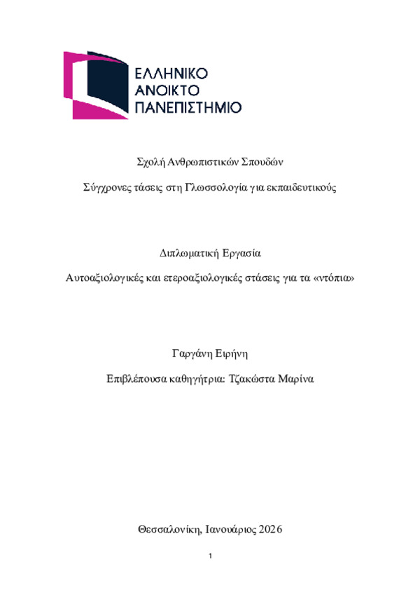 Περίληψη (Abstract): Η παρούσα διπλωματική εργασία αναλύει τις απόψεις των ομιλητών σχετικά με τη γλώσσα των Ρομά στην Αμαλιάδα. Καθώς εξετάζεται η σύνδεση ανάμεσα στη γλωσσική ταυτότητα, την κοινωνική αποδοχή και τις διακρίσεις που αντιμετωπίζει η μειονοτική κοινότητα των Ρομά, προσφέρεται μια σφαιρική εικόνα της κατάστασης. Η γλώσσα, ως θεμέλιος λίθος της πολιτισμικής κληρονομιάς και της κοινωνικής συνοχής, είναι τα...