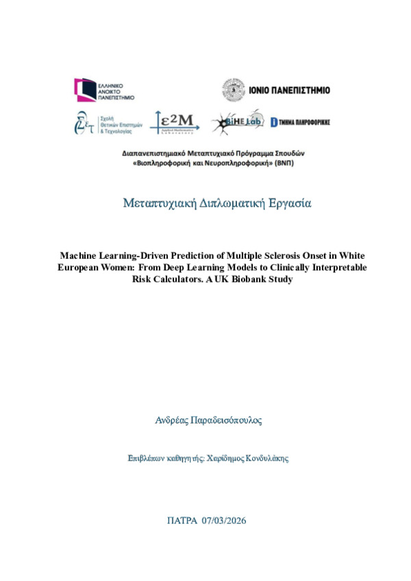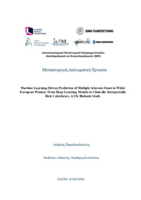 Περίληψη (Abstract): Multiple Sclerosis (MS) arises from complex interactions between immunogenetic susceptibility, environmental exposures, and sex-specific biological factors. This study develops and interprets machine-learning models for MS risk stratification in White European women using UK Biobank data. A rigorously filtered cohort of 237,103 participants was constructed, integrating high-confidence HLA imputati...