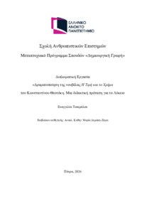 Περίληψη (Abstract): Η παρούσα διπλωματική εργασία εξετάζει τη θεατρικότητα στη Λογοτεχνία και τη δυναμική δραματοποίησης αφηγηματικού έργου ως παιδαγωγικού μέσου στη Δευτεροβάθμια εκπαίδευση. Στο θεωρητικό μέρος διερευνάται η σχέση λογοτεχνίας και θεάτρου, η έννοια της δραματικότητας καθώς και το πλαίσιο του Θεάτρου στην Εκπαίδευση . Αναλύεται και παρουσιάζεται η νουβέλα του Κωνσταντίνου Θεοτόκη Η Τιμή και το Χρήμα&n...