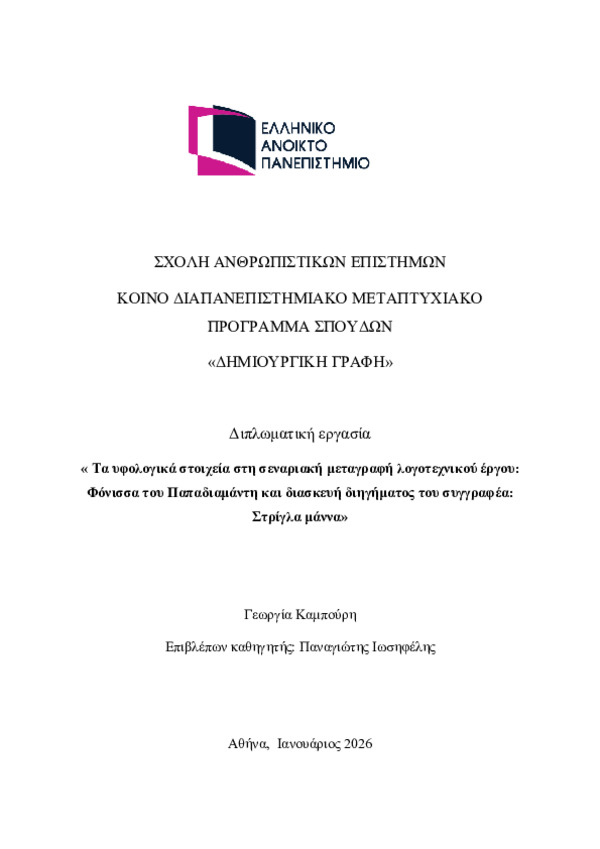Περίληψη (Abstract): Η παρούσα εργασία μελετά τα υφολογικά στοιχεία στη σεναριακή μεταγραφή του λογοτεχνικού έργου H Φόνισσα του Παπαδιαμάντη στην ομώνυμη κινηματογραφική ταινία του Κώστα Φέρρη (1974). Αρχικά εξετάζεται το ύφος του πρωτότυπου κειμένου και ποιοι παράγοντες συμβάλλουν στη διαμόρφωσή του, ενώ στη συνέχεια διερευνάται το κινηματογραφικό ύφος της ταινίας με έμφαση στα στοιχεία της μιζανσέν (...