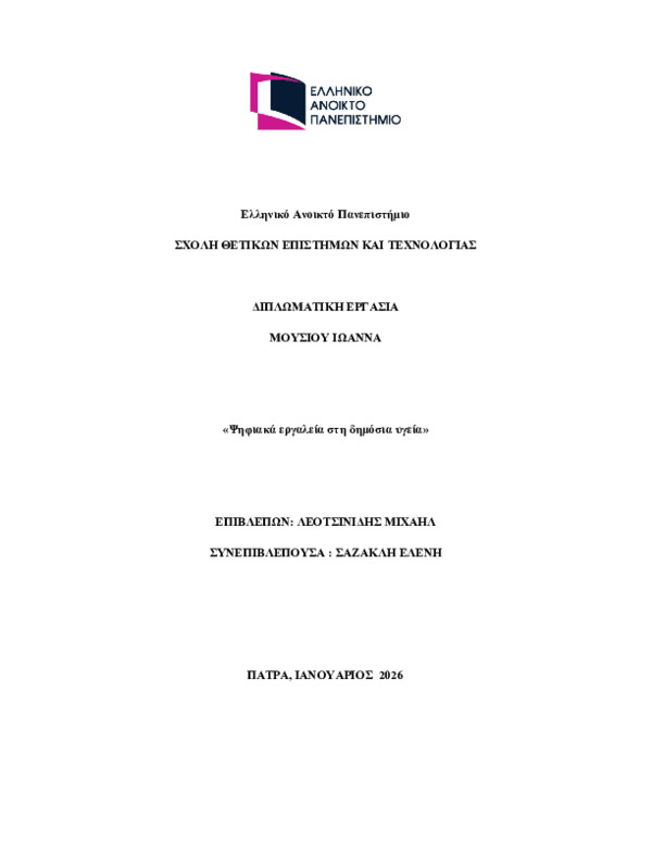 Abstract: Η παρούσα μελέτη εξέτασε τον ρόλο των ψηφιακών εργαλείων στη δημόσια υγεία καιτον ψηφιακό μετασχηματισμό ως βασικό παράγοντα για τη βελτίωση της οργάνωσης,της παροχής και της αξιολόγησης των υπηρεσιών υγείας. Πρωτίστως εξετάστηκε ηιστορική εξέλιξη, οι πτυχές της ψηφιακής υγείας, το παγκόσμιο πλαίσιο και ηεφαρμογή τους στην Ελλάδα, και τονίστηκε η σημασία των ψηφιακών τεχνολογιώνστην αύξηση της ποι...