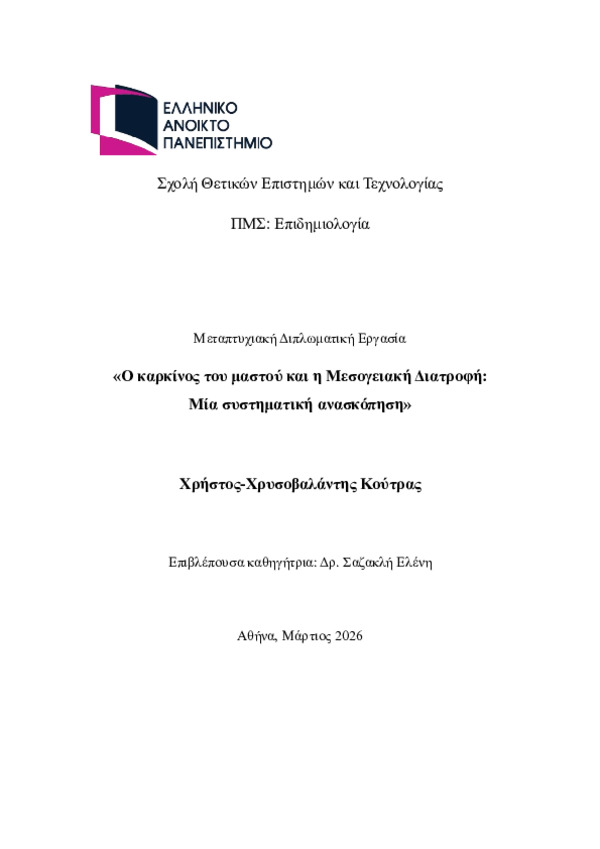 Abstract: Εισαγωγή: Ο καρκίνος του μαστού αποτελεί το συχνότερο τύπο κακοήθουςνεοπλάσματος στις γυναίκες παγκοσμίως, με σημαντική επιβάρυνση στη δημόσιαυγεία. Η διατροφή αποτελεί παράγοντα που μπορεί να επιδράσει στην εμφάνιση τουκαρκίνου του μαστού, ενώ η Μεσογειακή Διατροφή έχει προταθεί ως πρότυπο μεδυνητικά προστατευτική δράση. Παρόλα αυτά η σχέση της με την επίπτωση τουκαρκίνου του μαστού πρέπει να εξε...