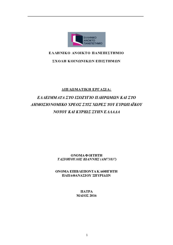 Περίληψη (Abstract): Το αντικείμενο της παρούσας εργασίας είναι η εξέλιξη του δημόσιου χρέους στην Ελλάδα και στις χώρες του Ευρωπαϊκού Νότου (Πορτογαλία, Ιταλία, Ισπανία), καθώς και η διερεύνηση των ελλειμμάτων στο ισοζύγιο πληρωμών των χωρών αυτών και κυρίως στην Ελλάδα. Σκοπός της εργασίας είναι να αναδείξει το αν το χρέος και τα ελλείμματα αυτά αυξήθηκαν ή μειώθηκαν και, κατ’ επέκταση, κατά πόσο οι πολιτικές που έ...