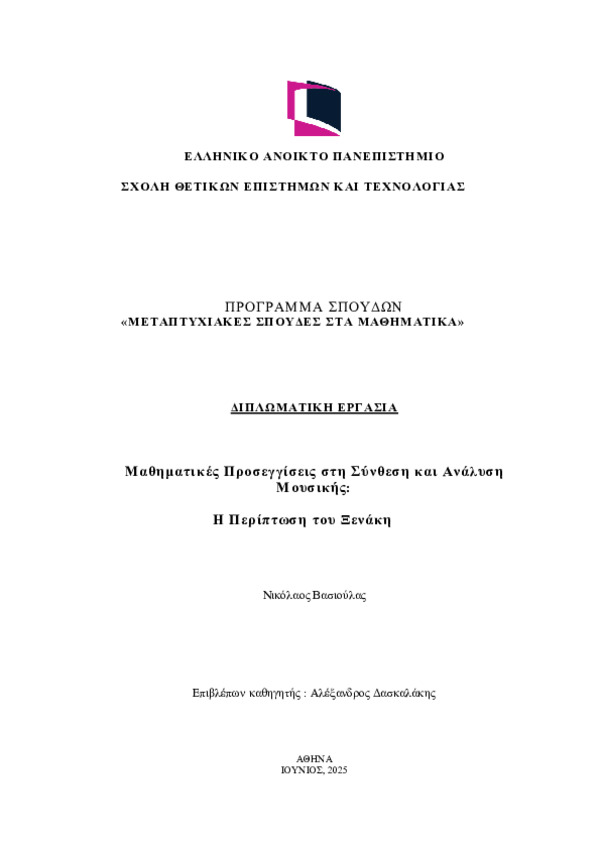 Περίληψη (Abstract): Η παρούσα διπλωματική εργασία εξετάζει τις μαθηματικές προσεγγίσεις στη σύνθεση και ανάλυση της μουσικής, με κεντρικό άξονα το έργο του Ιάννη Ξενάκη. Αρχικά παρουσιάζεται η ιστορική σύνδεση των μαθηματικών με τη μουσική, από την αρχαιότητα έως τον 20ό αιώνα, αναδεικνύοντας το θεωρητικό υπόβαθρο που καθιστά εφικτή τη μαθηματικοποίηση της σύνθεσης. Στη συνέχεια, αναλύονται βασικά εργαλεία όπως η θεω...