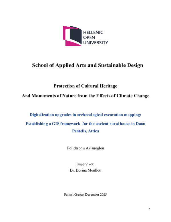 Περίληψη (Abstract): This dissertation investigates the vulnerability of the archaeological site of Mycenae in light of contemporary challenges posed by climate change and increasing visitor pressure. As a designated UNESCO World Heritage Site and a prominent cultural tourism destination, Mycenae is increasingly threatened by environmental stressors, including rising temperatures, extreme weather events, erosion, and ...