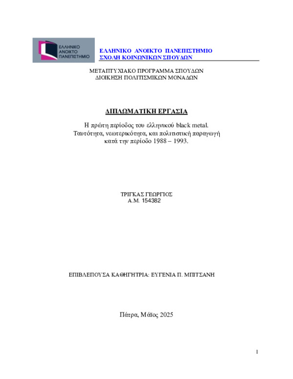 Περίληψη (Abstract): Η παρούσα διπλωματική εργασία εστιάζει στο υποείδος της heavy metal μουσικής, black metal όπως αυτό αναπτύχθηκε στη χώρα μας κατά την πρώτη περίοδο της σκηνής (1988 – 1993). Η συγκεκριμένη μουσική, αν και είναι κυρίως ταυτισμένη με τις σκανδιναβικές χώρες, βρήκε σημαντικά ερείσματα αρκετά νωρίς ανάμεσα στους Έλληνες ακροατές του μέταλ (metal) υποπολιτισμού κατασκευάζοντας τελικά τη δική της κουλτο...
